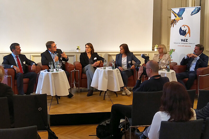 Berlin, 11. Mai 2022. Zum zweiten Mal ging gestern ein Parlamentarischer Abend des Verbandes der Zoologischen Gärten über die Bühne des politischen Berlins. In der Deutschen Parlamentarischen Gesellschaft trafen sich ab dem frühen Abend zahlreiche Mitglieder des Bundestages mit der zoologischen Welt und ihren Partnern. VdZ-Präsident Jörg Junhold eröffnete den Abend und übergab im Anschluss das Wort an die Schirmherrin der Veranstaltung, die Parlamentarische Staatssekretärin im Bundesumweltministerium Bettina Hoffmann. Sie sprach über die Anknüpfungspunkte für zoologische Gärten im Kontext der globalen Herausforderungen im Natur- und Artenschutz. Sabine Riewenherm, Präsidentin des Bundesamtes für Naturschutz, übernahm anschließend das Rednerpult und erörterte die Verantwortung moderner Zoos vor dem Hintergrund von unter anderem Forschung und Umweltbildung. Den Abschluss des offiziellen Teils des Abends bildete die spannende Gesprächsrunde "Zoos von heute - nur noch kurz die Welt retten", bei der durchaus auch kontroverse Meinungen ausgetauscht wurden. Moderiert von Tanja Busse saßen neben VdZ-Geschäftsführer Volker Homes noch Tierärztin und Bundestagsmitglied Franziska Kersten, der Direktor von Zoo und Tierpark Berlin, Andreas Knieriem, Staatssekretärin Hoffmann und der NABU-Präsident Jörg-Andreas Krüger auf dem Podium. Auch die Gespräche im gelösten Teil des Abends werden sicherlich noch lange nachwirken.