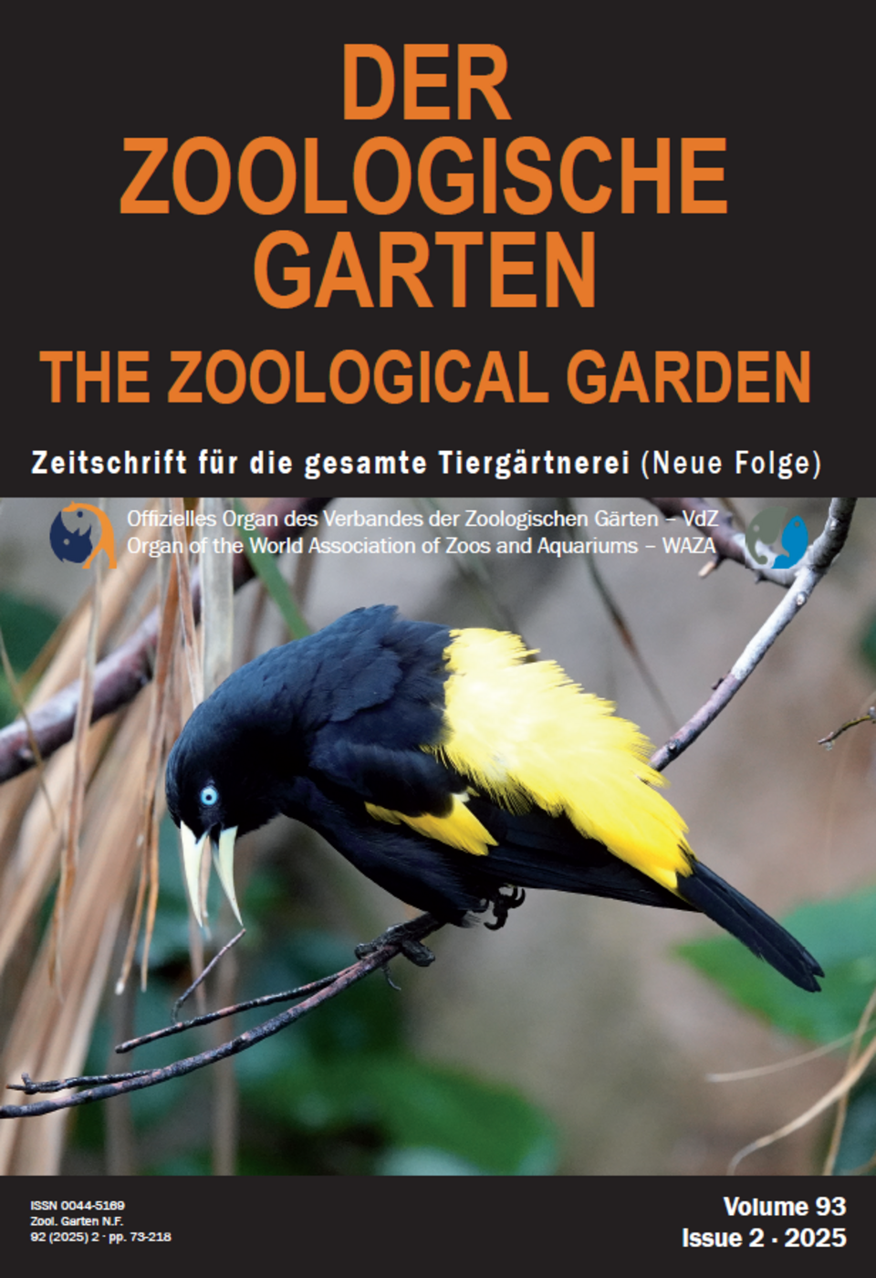 Der Zoologische Garten: Wissenschaft im Dienste des Tierwohls Hier finden Sie alle Gesamtausgaben seit 2019 und seit 2023 auch die Einzelartikel der Autorinnen und Autoren 2025/2 Der Zoologische Garten 93/2 Ausgabe 2-2025: Hier finden Sie die komplette Ausgabe zum Herunterladen. weiterlesen ZooGa 93/2: Schiffbauer, Lara & Marcordes, Bernd Analyse der globalen Haltungs- und Zuchtbedingungen von Klunkerkranichen (Bugeranus carunculatus)… weiterlesen ZooGa 93/2: Honigs et al. Erste Ergebnisse zur individuellen Identifi zierung von Telmatobius culeus (Garman, 1876) anhand von… weiterlesen ZooGa 93/2: Moore, Oliver Pritchard Das Gleichgewicht finden: Der Aufstieg der Tierernährung in Zoos weiterlesen ZooGa 93/2: Polotzek et al. Haltung, Fütterung, veterinärmedizinische Aspekte, pathologische Befunde und historische… weiterlesen ZooGa 93/2: Sliwa et al. Zucht der Gelbbürzelkassike (Cacicus cela) im Kölner Zoo weiterlesen ZooGa 93/2: Schmidt, Christian R. In Memoriam Prof. Dr. Gunther Nogge weiterlesen ZooGa 93/2: Dreßen, Wolfgang In Memoriam Dr. Paul Vogt weiterlesen 2025/1 Der Zoologische Garten 93/1 Ausgabe 1-2025: Hier finden Sie die komplette Ausgabe zum Herunterladen. weiterlesen ZooGa 93/1: Nogge, Gunther The roaring eighties 1982 – 1985 – 1988 weiterlesen ZooGa 93/1: Göbel, Miriam & Wilms, Thomas Futtermotivierte Beschäftigung und ihr Einfl uss auf das Verhalten und das Auftreten von… weiterlesen ZooGa 93/1: Faust, Taissa S. & Bernhard, Ron Erster erfolgreicher Langstreckentransport von ausgewachsenen Arapaima gigas (Schinz, 1882) in… weiterlesen ZooGa 93/1: Thalken et al. Enrichment bei wilden Schweinen (Suidae) in europäischen Zoos und enrichment-bedingte… weiterlesen ZooGa 93/1: Stawinoga, Marcel Die Erfindung der Zoos - kommunikative Chancen und Herausforderungen durch Soziale Medien im Kampf… weiterlesen ZooGa 93/1: Schürer, Ulrich In Memoriam Wolf-Dietrich Gürtler und in Memoriam Prof. Dr. Dieter Jauch weiterlesen 2024/2 Der Zoologische Garten 92/2 Ausgabe 2-2024: Hier finden Sie die komplette Ausgabe zum Herunterladen. weiterlesen ZooGa 92/2: Schiffmann et al. Weniger gelaufen, aber weiter gekommen – die Anwesenheit eines Bullen reduziert die Laufaktivität,… weiterlesen ZooGa 92/2: English et al. Die erste Verhaltensbeobachtung bei ex-situ gehaltenen Bengaltrappen (Houbaropsis bengalensis… weiterlesen ZooGa 92/2: Gippoliti, Spartaco & Ziegler, Thomas Taxonomy goes Zoos: die unvermeidliche Bedeutung von Artabgrenzungen und der Anerkennung von… weiterlesen ZooGa 92/2: Panayi et al. Untersuchung des Effekts der Futterpräsentation auf das Verhalten von Mohrenmakis weiterlesen ZooGa 92/2: Overberg et al. Gehegenutzung einer Gruppe von Gelbbrustkapuzinern (Sapajus xanthosternos) im Allwetterzoo Münster weiterlesen ZooGa 92/2: Wendt, Finn & Kück, Heike Die Zucht von Nagelrochen (Raja clavata Linnaeus, 1758) im Zoo am Meer Bremerhaven weiterlesen ZooGa 92/2: Höft, Sabrina M. & Gansloßer, Udo Erstellung eines Ethogramms für Klippschliefer (Procavia capensis) anhand einer Gruppe im Zoo… weiterlesen ZooGa 92/2: Pechlaner, Helmut & Ulrich, Dirk In Memoriam VR Dr. Klaus Teuchner weiterlesen 2024/1 Der Zoologische Garten 92/1 Ausgabe 1-2024: Hier finden Sie die komplette Ausgabe zum Herunterladen. weiterlesen ZooGa 92/1: van den Berg et al. Die Auswirkungen der Beweidung mit Niederländischen Landziegen und Bentheimer Landschafen in einem… weiterlesen ZooGa 92/1: Tai et al. Japan’s Native Domestic Animals – A Living Cultural Heritage. weiterlesen ZooGa 92/1: Velte, Frank Bemerkenswertes Lebensalter beim Dromedar. weiterlesen ZooGa 92/1: Davison et al. Gotta Chop ‘em All? Investigating the impact of food presentation on zoo-housed Azara’s agoutis. weiterlesen ZooGa 92/1: Honigs, Sandra & Hartmut Greven Gundis (Ctenodactylus gundi (Rothmann, 1776)) in European Zoos. Since when, how to keep, and why? weiterlesen ZooGa 92/1: Komornik et al. Case report: COVID 19-Vaccination of two captive adult Bornean Orangutans (Pongo pygmaeus). weiterlesen ZooGa 92/1: Göbel et al. Breeding Station for the European Hamster (Cricetus cricetus Linnaeus, 1785) at Opel-Zoo Kronberg weiterlesen ZooGa 92/1: Kleinlugtenbelt et al. Killing zoo animals to feed carnivores in Germanspeaking zoos and its acceptance by staff,… weiterlesen 2023/2 Der Zoologische Garten 91/2 Ausgabe 2-2023: Hier finden Sie die komplette Ausgabe zum Herunterladen. weiterlesen ZooGa 91/2: Pagel, Theo Foreword. weiterlesen ZooGa 91/2: Rodríguez, Jon Paul Special Issue 50 Years Dolphin Husbandry at Nuremberg Zoo. weiterlesen ZooGa 91/2: von Fersen, Lorenzo & Philip S. Miller Integrated Conservation Action for Small Cetaceans: A new Role for Modern Dolphinaria. weiterlesen ZooGa 91/2: Taylor et al. Integrated Conservation Planning for Cetaceans. weiterlesen ZooGa 91/2: Nachtigall et al. Measuring Hearing in Odontocete Cetaceans. weiterlesen ZooGa 91/2: Smith et al. Applying Navy Dolphin Medicine to Conservation Medicine for Small Cetaceans. weiterlesen ZooGa 91/2: Baumgart et al. Development of Bottlenose Dolphin (Tursiops truncatus) Management at the Nuremberg and Duisburg Zoo over the past 50-plus years. weiterlesen ZooGa 91/2: Hao et al. Recent Progress and Future Directions for Conservation of the Yangtze Finless Porpoise (Neophocaena asiaorientalis asiaorientalis). weiterlesen ZooGa 91/2: Secchi et al. A Stepwise Approach for Science-based Conservation of Lahille’s Bottlenose Dolphins (Tursiops gephyreus) with Emphasis on the Patos Lagoon Population. weiterlesen 2023/1 Der Zoologische Garten 91/1 Ausgabe 1-2023: Hier finden Sie die komplette Ausgabe zum Herunterladen. weiterlesen ZooGa 91/1: Polotzek, Martin & Schwarzenberger, Franz Non-invasive reproductive monitoring in round-eared elephant shrews (Macroscelides proboscideus). weiterlesen ZooGa 91/1: Kleinlugtenbelt et al. Large carnivore feeding in European zoos. weiterlesen ZooGa 91/1: Schmidt, Christian R. Saisonalität von Geb