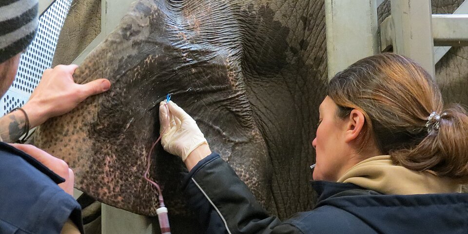 Kein Tier geht gerne zum Tierarzt. Viele Zootiere erkennen das veterinärmedizinische Personal bereits aus der Ferne und sind – trotz dessen guten Absichten – kaum gewillt, „mitzuarbeiten“. Um hier Abhilfe zu schaffen, führen viele VdZ-Zoos regelmäßig das sogenannte Medizinische Training durch. Hierbei werden gesunde Tiere per Belohnungsverfahren darauf trainiert, bei potenziellen medizinischen Untersuchungen auf freiwilliger Basis mitzuwirken. So werden das Abtasten, Urin- und Blutentnahmen, das Maul öffnen, Ohrmuschelkontrollen, Ultraschall sowie das Verabreichen von Injektionen oder Augentropfen simuliert und trainiert.